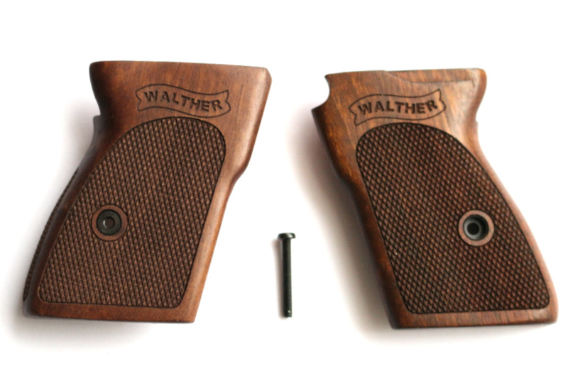 Střenky pro pistoli Walther P38 a Walther P-1. Ořechové dřevo, povrch rybina a vyryté logo Walther.