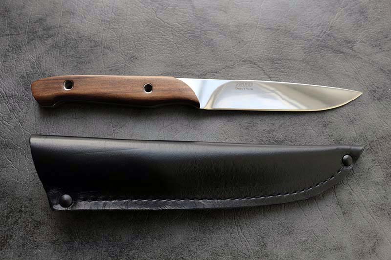 Lovecký nůž s poměrně tlustou čepelí tl. 3,6mm. Kožené pouzdro, rukojeť z kavkazského ořechu. Novinka roku 2014.